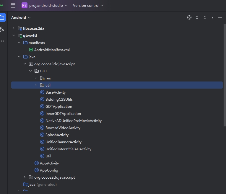 proj.android-studio/app/src/main/AndroidManifest.xml中添加优量汇所需的权限和服务:<!--相关权限声明 : SDK不强制校验下列权限(即:无下面权限sdk也可正常工作),但建议开发者申请下面权限,尤其是READ_PHONE_STATE权限--> <!--READ_PHONE_STATE权限用于允许SDK获取用户标识,针对单媒体的用户,允许获取权限的,投放定向广告;不允许获取权限的用户,投放通投广告,媒体可以选择是否把用户标识数据提供给优量汇,并承担相应广告填充和eCPM单价下降损失的结果。--> <uses-permission android:name="android.permission.READ_PHONE_STATE" /> <uses-permission android:name="android.permission.ACCESS_COARSE_LOCATION" /> <!-- 高于Android 7的系统上,如果应用的 targetSdkVersion >= 26 ,推荐增加权限声明(SDK将通过此权限触发App安装动作)--> <uses-permission android:name="android.permission.REQUEST_INSTALL_PACKAGES" /> <!-- 高于Android 11的系统上,如果应用的 targetSdkVersion >= 30 ,推荐增加以下权限声明(SDK将通过此权限正常触发广告行为,并保证广告的正确投放。此权限需要在用户隐私文档中声明。)--> <uses-permission android:name="android.permission.QUERY_ALL_PACKAGES" tools:ignore="QueryAllPackagesPermission" /> <!--检测当前⽹络状态是2G、3G、4G还是WiFi--> <uses-permission android:name="android.permission.ACCESS_NETWORK_STATE" /> <!--联⽹权限--> <uses-permission android:name="android.permission.INTERNET" /> <!--读写存储权限--> <uses-permission android:name="android.permission.READ_EXTERNAL_STORAGE" /> <uses-permission android:name="android.permission.WRITE_EXTERNAL_STORAGE" /> <!--获取MAC地址,⽤于标识⽤户--> <uses-permission android:name="android.permission.ACCESS_WIFI_STATE" /> <!--定位权限,不强制要求--> <uses-permission android:name="android.permission.ACCESS_FINE_LOCATION" />application部分: